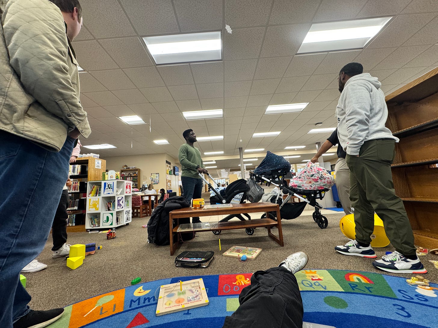The little ones tore through the library, not a toy left untouched, and the librarians were wonderful. They brought out extra toys for us, the good stuff, the kind they don’t usually leave out - puppets, marble runs, and a Toniebox playing the latest and greatest kid tunes. They even played with some of the little ones that tried to wander off as the dads talked – thank you Ms. Carla and Ms. Mcayla!